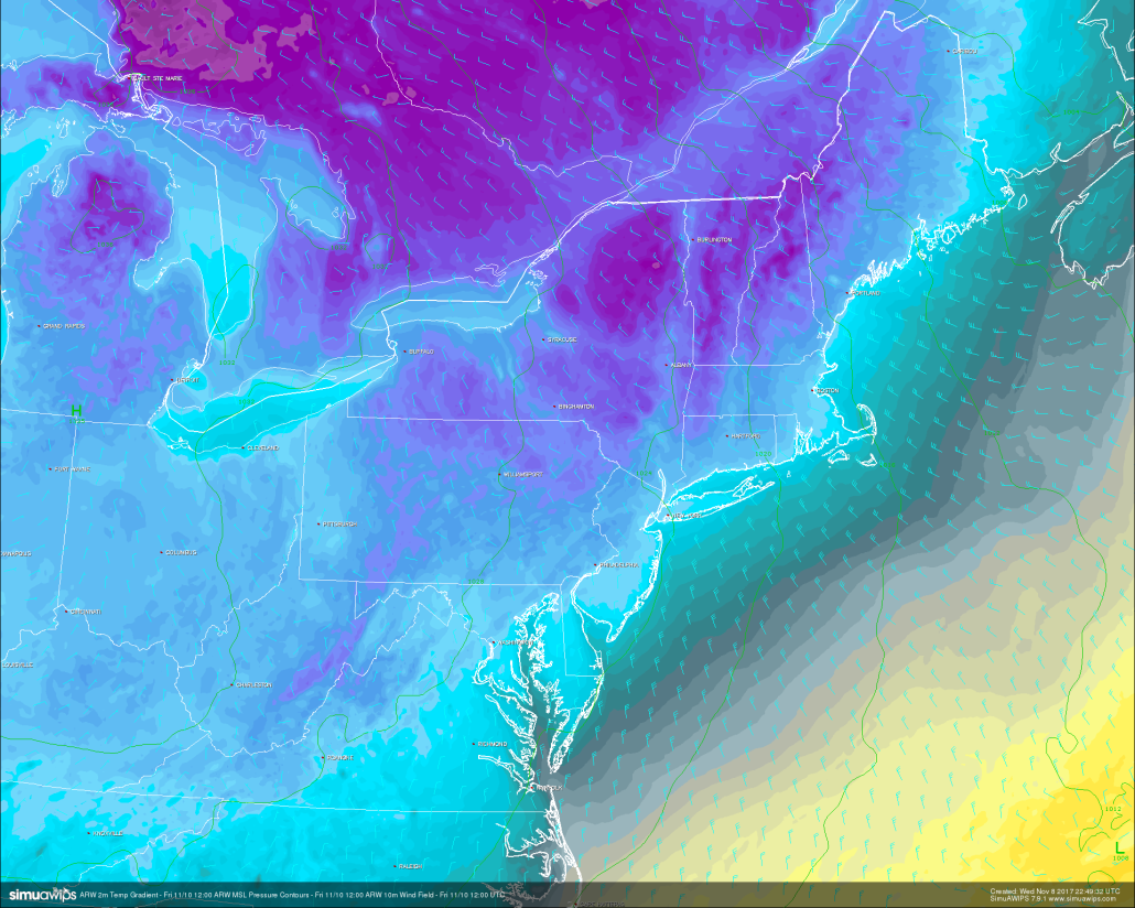 Friday should see the full brunt of this Arctic front starting very early in the morning, with the boundary likely clearing the NYC area before dawn. We may see a situation on Friday where the early morning temperatures that take place before the front arrives are actually the highs for the day, with temperatures steadily dropping thereafter. Behind the Arctic blast, skies will likely be partly cloudy, with some locations possibly evening seeing some bursts of snow as moisture streams off of the Great Lakes, which are still quite warm. Winds will also begin to pick up during the day, with gusts likely in the 20-25 mph range. With Fridays highs likely being set in the very early morning, afternoon temperatures should drop into the lower to middle 30’s, with wind chills likely in the teens and 20’s. Friday night will be the coldest night the Northeast has seen since earlier this winter, with overnight lows dropping into the teens and lower 20’s and windchill’s dropping into the single-digits and teens! These temperatures will be more akin to January than November, and will likely be 15-25 degrees below normal across the entire Northeast!