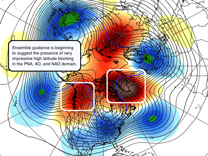 The GEFS and, to a certain extent, the ECMWF EPS suggest that zonal winds will reverse (or near-reverse) at multiple levels. This will leave the polar vortex extremely vulnerable. As the stratospheric polar vortex becomes perturbed and the higher latitude heights become more susceptible to movement and breaks, medium and long range forecast models are beginning to suggest the potential for much higher than normal heights in the higher latitudes (a.k.a. blocking). This is most significant as we are seeing signals for higher latitude ridging both on the Pacific and Atlantic sides, from British Columbia into Western Canada and Greenland towards the Davis Strait.
