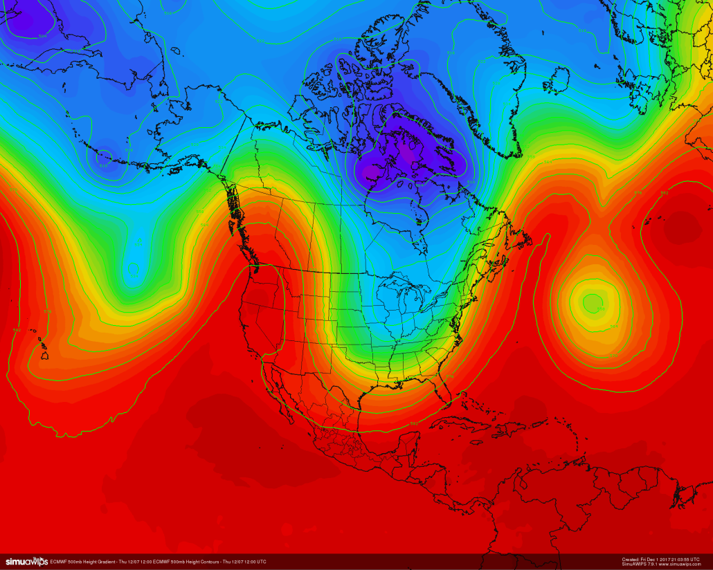 This afternoons ECMWF model showing the zonal flow pattern that the CONUS has been stuck in for a while now. The west to east flow does not allow for systems to slow down and strengthen, leading to relatively dry and quiet conditions across s the country
