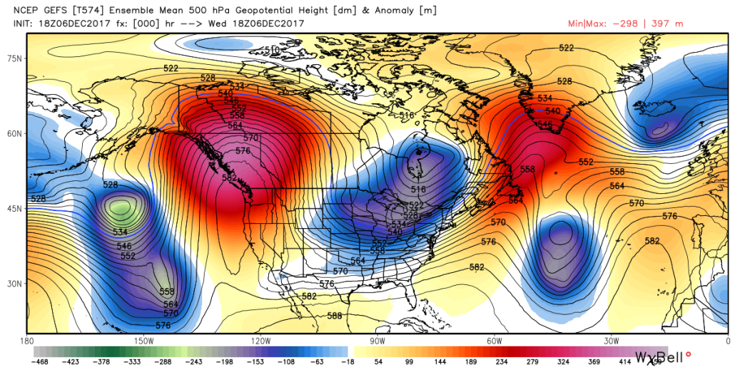 Well, we have been talking about the pattern change for around two weeks now, and things have transpired according to plan across much of the Northern Hemisphere. We have a massive area of ridging set up over the West Coast that has caused record high temperatures as well as wildfires across California. Our second area of ridging has taken shape over Greenland and both of these features have led to a deep trough digging into the central US and east, which we’ll discuss in further detail in just a bit. Today was a cooler and calmer day across the entire Northeast after the passage of a rather large cold front that moved through yesterday evening. While the immediate temperature change didn’t occur for hours, the front did bring in a new Arctic source region for our airmass for the duration of the week. This new Arctic airmass has been modified somewhat was leftover Pacific air, but partly cloud skies and cooler temperatures aloft allowed highs to only get into the upper 30’s and lower 40’s this afternoon, with some slightly warmer readings closer to the coast. The main story behind this front was the dramatically decreasing dewpoints across the entire Northeast, signalling the arrival of a dry continental polar airmass. Additionally, winds were a bit gusty this afternoon, on the order of 15-20 miles per hour, which certainly added to the winter chill in the air. Calm conditions should continue throughout the evening, with light winds from the southwest taking over. Despite the southwesterly winds, cold air advection is expected over much of the area, with decent conditions for radiational cooling to take place. Overall, expect a rather chilly night with lows in the upper 20’s and lower 30’s near the New York City metro, and lower to middle 20’s further to the north and west.