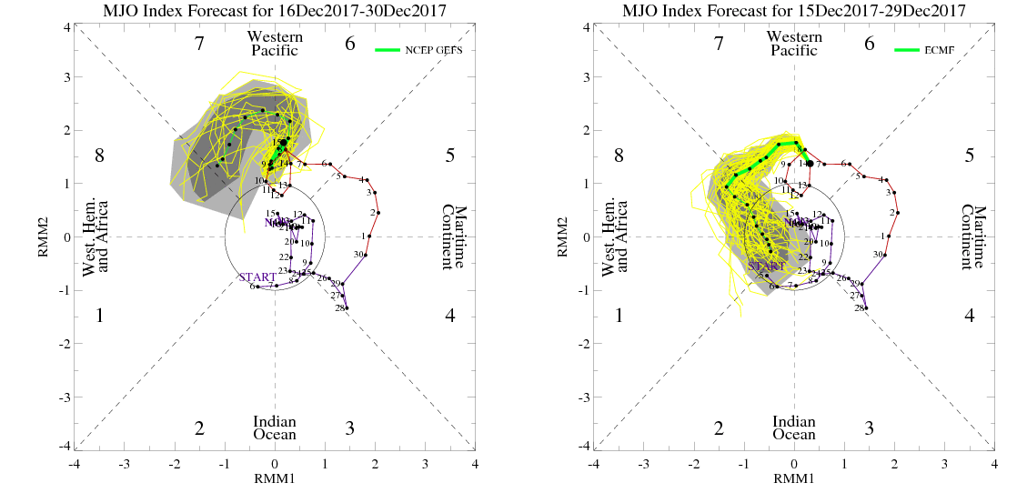 GEFS MJO forecast stronger in phase 7 on the right. While the ECMWF ensemble MJO forecast propagating into phase 8