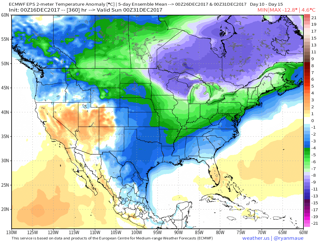 Latest ECMWF EPS showing 2 meter (surface) temperatures below normal with arctic cold air over much of the United States between Christmas and New Years.