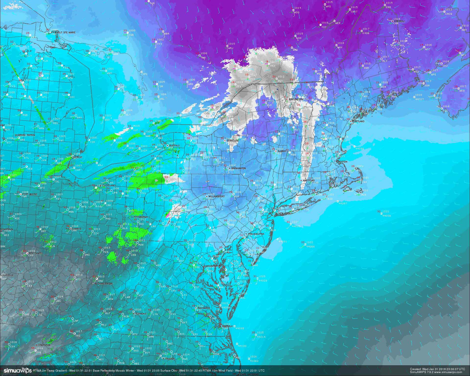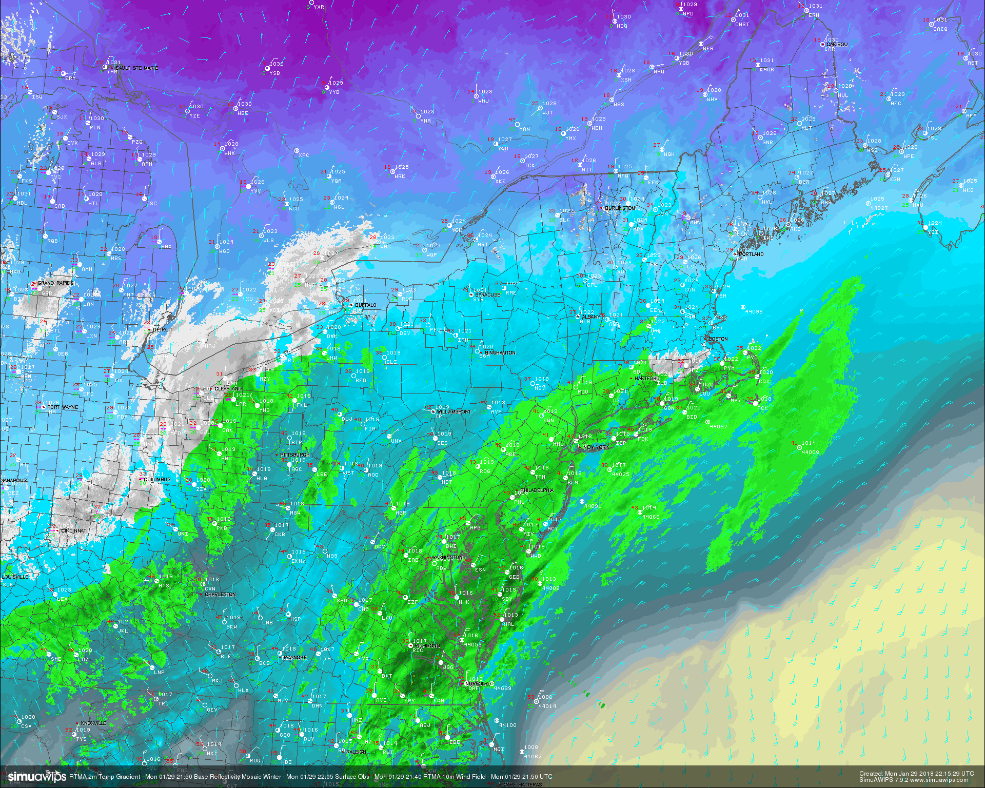 This evenings latest 2m RTMA temperatures, surface observations, and regional radar mosaic. Note the weak area of light snow and flurries over New England associated with some disorganized energy over southern Canada.