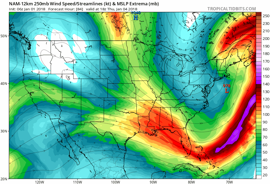 The last 6 runs of the NAM showing the trend in the 250mb jet (focus north of Maine). It’s showing the jet being stronger and more buckled to the west, which aids in expanding precipitation westward. This indicates that the very dry GFS is probably wrong (Tropical Tidbits).