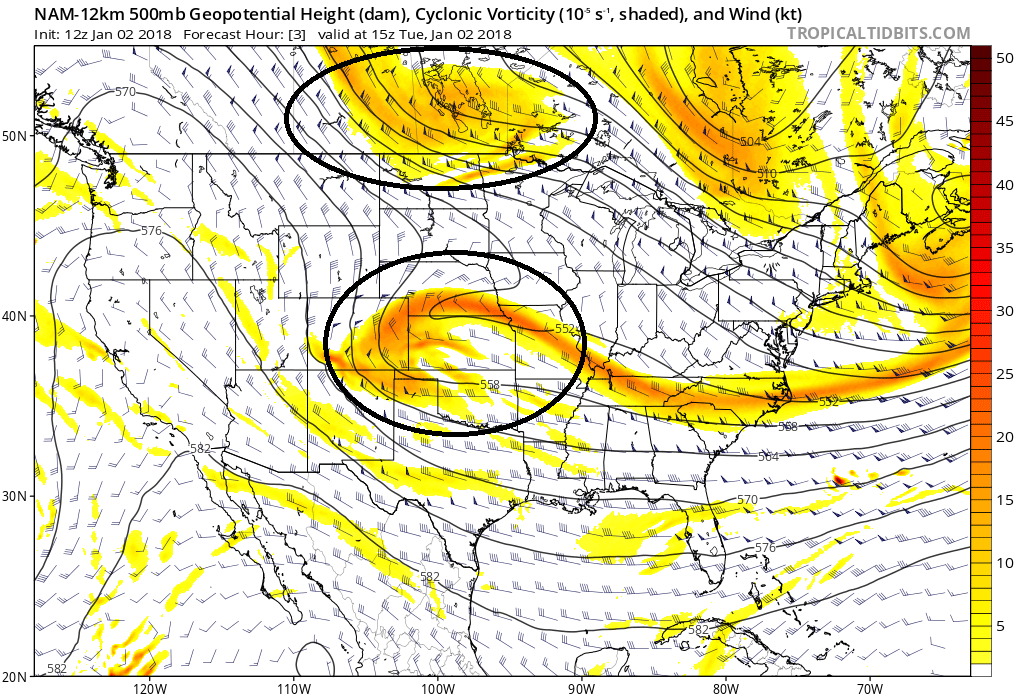 The first disturbance responsible for the storm’s development is situated over the North-Central United States right now, meandering southward from the Northern Plains. The disturbance will continue to shift southward into the Plains states, seemingly harmlessly, in what would otherwise likely be a non-eventful evolution. But lurking back to the west-northwest is a disturbance from the Pacific Ocean, which will drop southward into Alberta, Canada over the top of a large ridge in the Western United States.