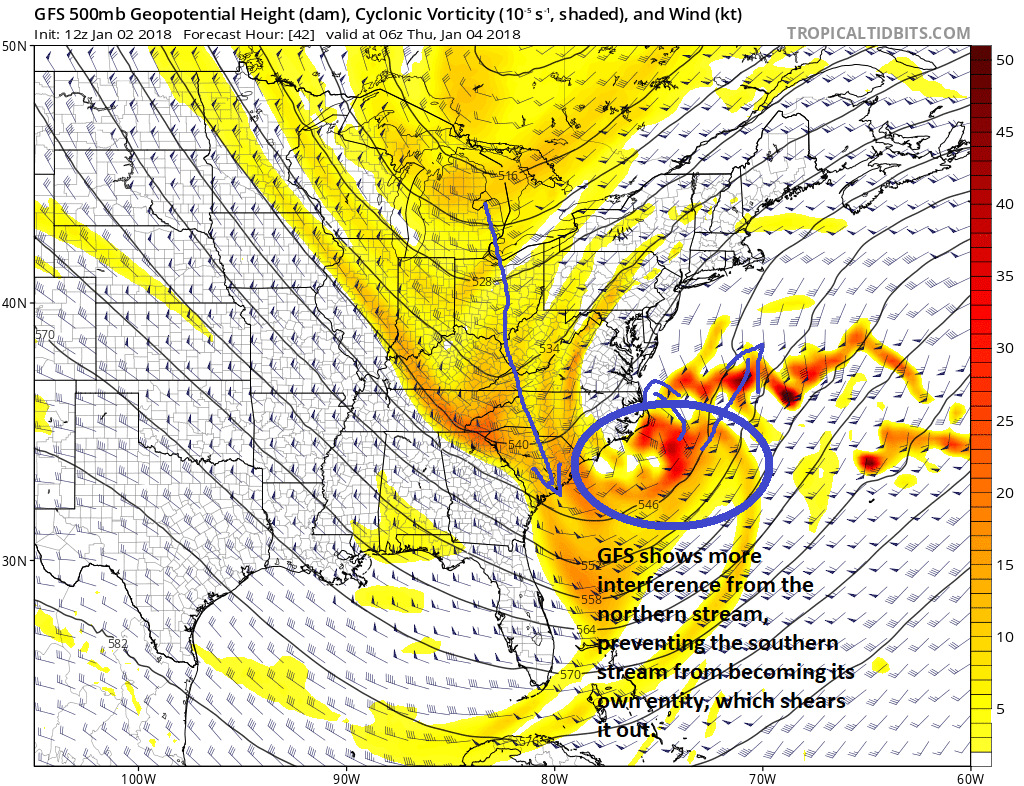 So what, exactly, is causing these differences amongst forecast models? It all has to do with the interaction between the two disturbances we mentioned earlier, and the way which the atmospheric flow aligns itself along the coast. The GFS, ECMWF and other global models suggest the southern stream shortwave will almost “slip” east before turning north, which takes the system far enough away to avoid major impacts along the coast.