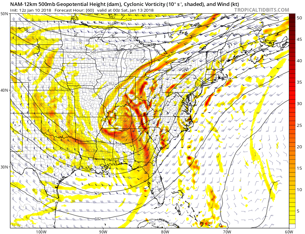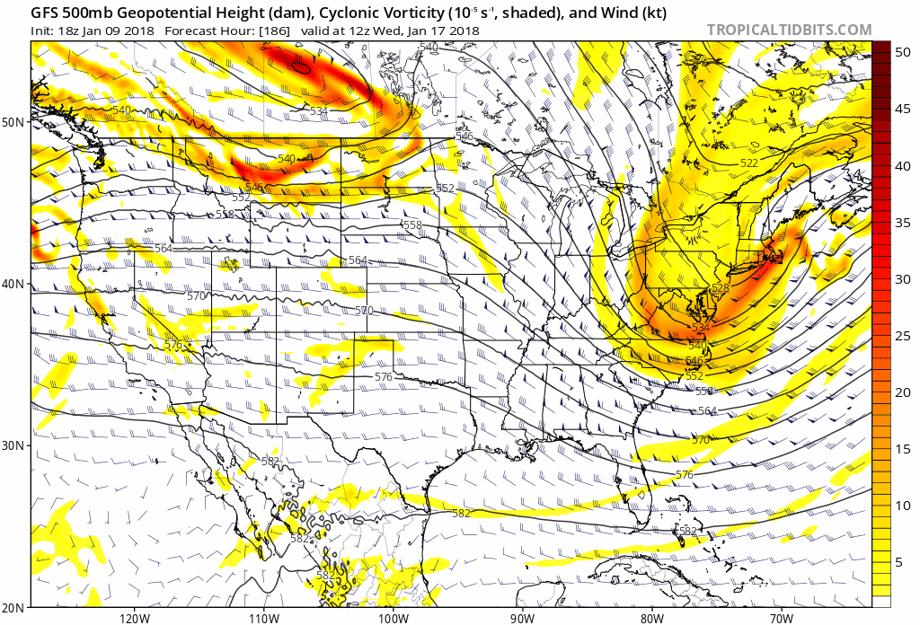 0z and 6z GFS models runs with 500mb heights and vorticity .The 6z run shows a more progressive solution than 0z run, where Pacific energy moves into Midwest collapsing he PNA ridge. Thus doesn’t allow for more trough amplification and shortwave phasing into a closed low over the Northern Mid-Atlantic region.