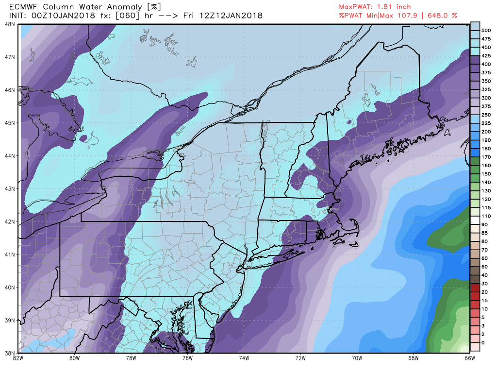 ECMWF model showing precipitable water values 400% above normal by Friday morning, support very heavy rainfall over parts of Northeast and Mid-Atlantic region