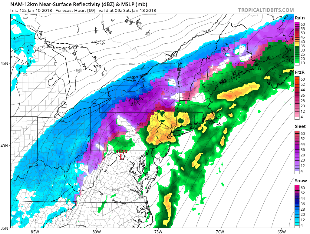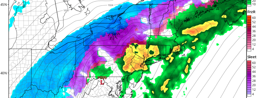 Farther to the north and west of track large arctic high pressure nosing into Southeast Canada will allow for more cold-air to wrapping around this low as begins to consolidate. Thus more snow, sleet and freezing rain is possible the Interior parts of the Northeast. Some western and northern areas of New York State, Pennsylvania and New England may see some significant snow and ice accumulations by the time this winds down later Saturday afternoon. This could result more hazardous weather conditions, for anyone in these areas. It’s also not of the question that rain ends Saturday afternoon as light wintry mix or some snow showers down to the I-95 corridor and coastal areas as well. But no snow or ice accumulations of consequence are likely.