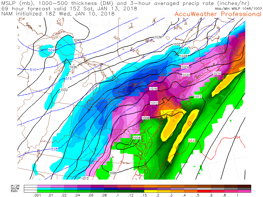 Low pressure will be tracking from the Tennessee valley and into the Mid Atlantic states on Friday evening and into the overnight hours as a large Arctic high pressure system extends from the northern Plain and into portions of southeast Canada. By early Saturday morning the low will likely be located over the Mid Atlantic states, with a large area of moderate to heavy precipitation over the Northeast. This part of the forecast becomes tricky, as some of our more reliable models have been trending weaker and further southeast with this area of low pressure on Saturday. This is very important detail to nail-down in the 24 hours, as the Arctic high pressure extension will be capable of bleeding sub-freezing air into the Northeast, and this could lead to a significant amount of Saturdays precipitation being frozen for portions of New England and potentially locations further south.