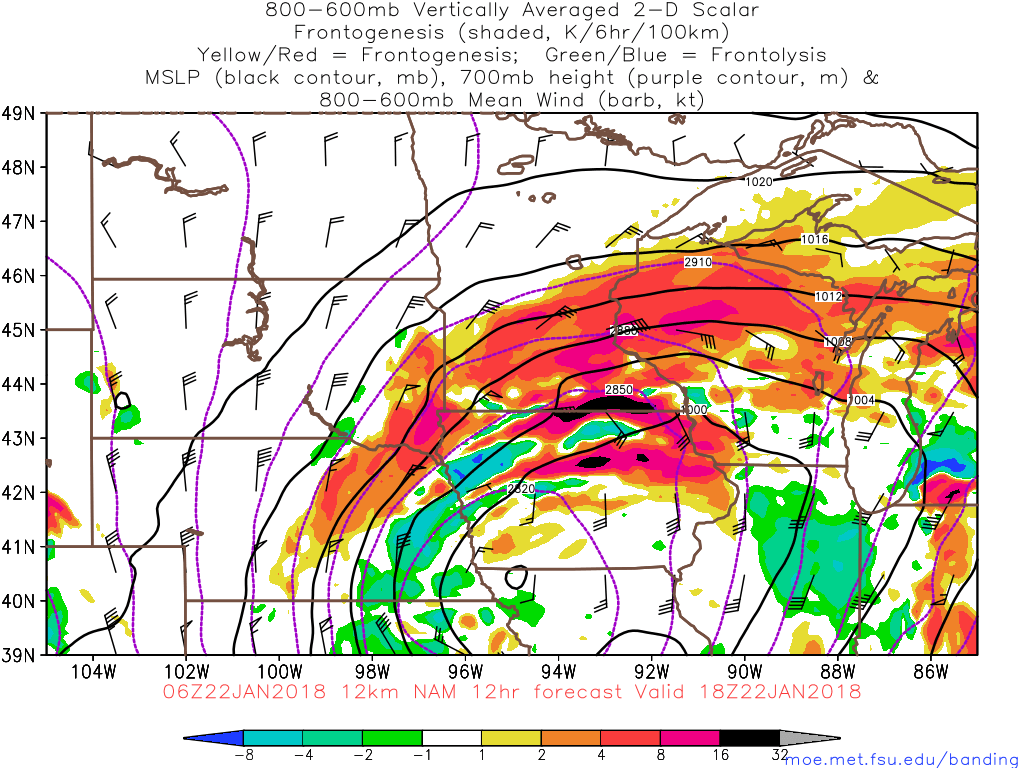 Pictured above, the NAM model suggests the development of very heavy frontogenesis banding along a thermal gradient in the atmosphere across the Northern Plains states today. This will lead to the development of impressive lift, and with plentiful moisture and jet dynamics in place, heavy snow is expected across Northeast Nebraska, Northern Iowa, Southern Minnesota and Wisconsin, with blizzard conditions in many areas and heavy snowfall in cities such as Minneapolis and St. Paul.