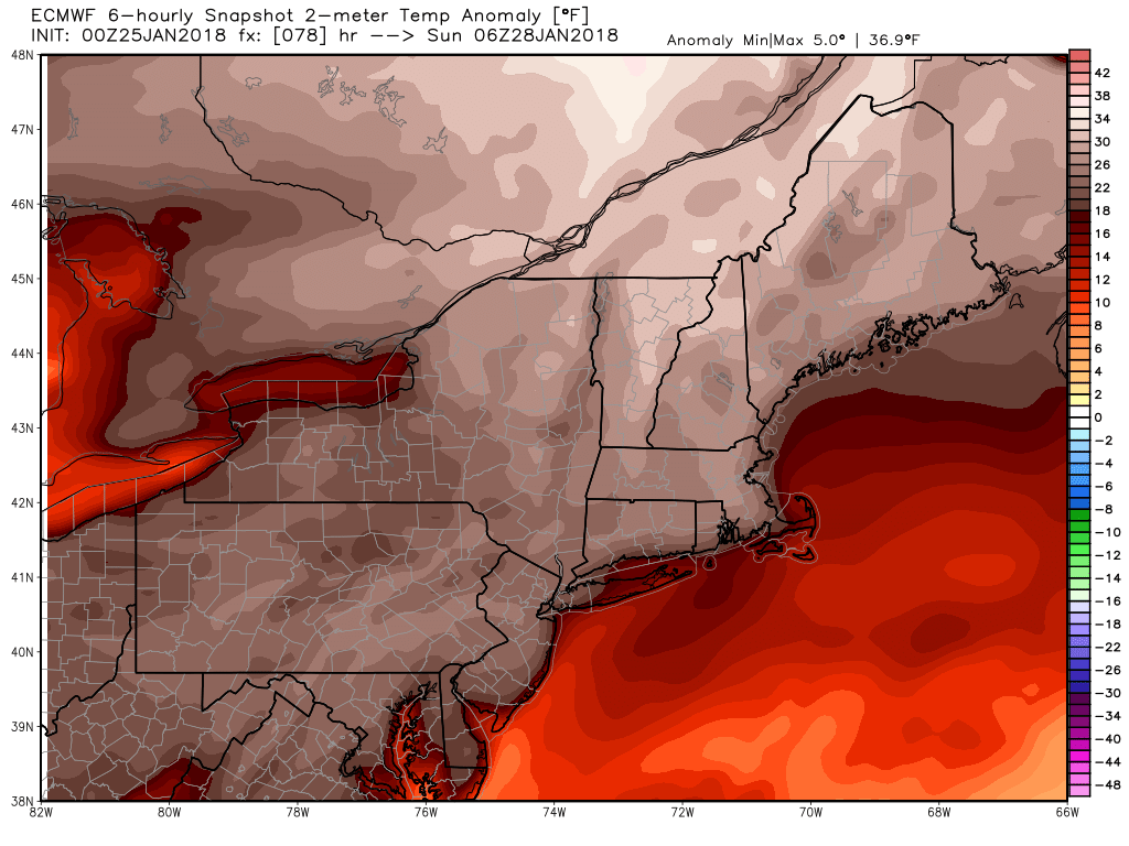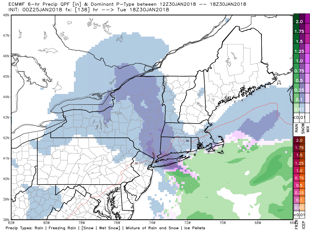 ECMWF model showing an inverted trough with a light to moderate band of snow over parts over the Northeast on Tuesday