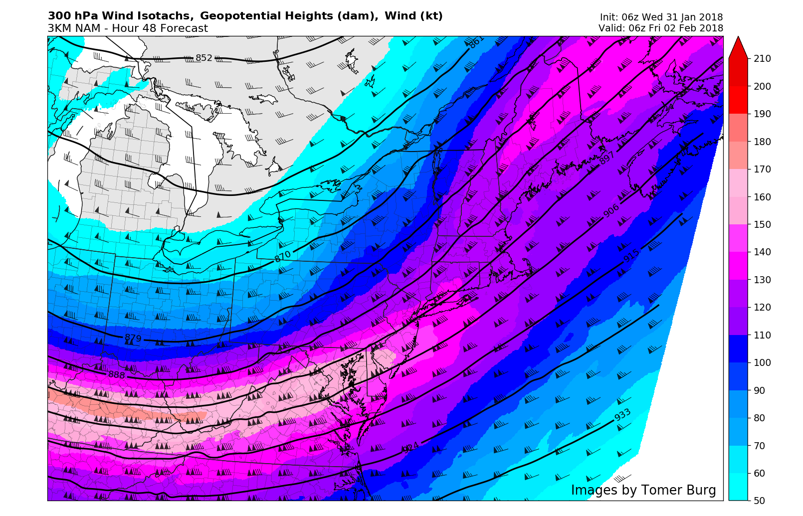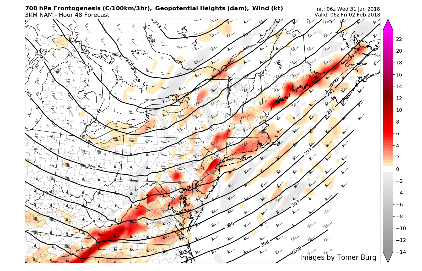 NAM model showing left-exit region of a 300mb jet streak passing over Mid-Atlantic and New England regions Thursday night