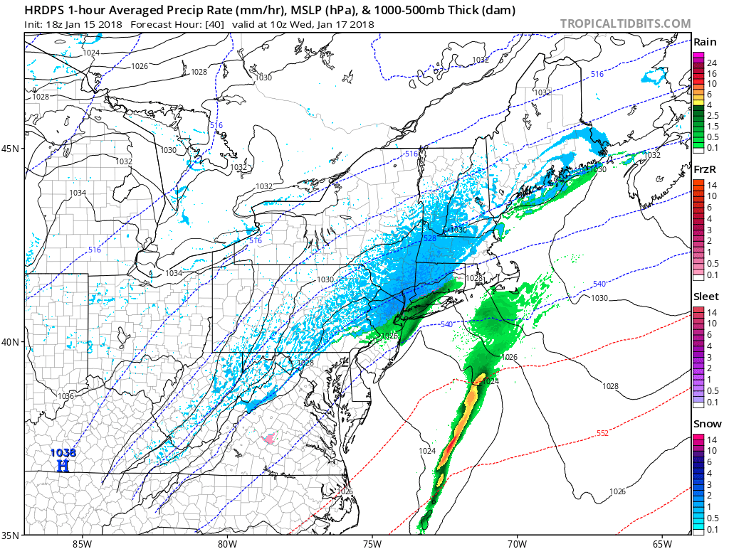 A weak surface front associated with some more robust moisture from the Atlantic will begin to develop off the Mid Atlantic coast during the late afternoon hours and into the evening on Tuesday. This afternoons models have shown more of the moisture becoming super-imposed with the upper level jet streak aloft, which allows a very weak coastal low to develop off of the Delmarva peninsula by 8-10pm tomorrow night. Depending on the track of this low and the associated moisture plume, we could see more moderate snow develop over eastern PA, MD, VA, SNY, eastern NJ and Connecticut during the overnight hours. Again, precip type may be more wet than white closer to the coast, but we could see a gradual shift to snow during the morning commute for locations to the south and east of NYC. This weak low pressure system will be moving at pretty good clip, so as of now we expect that snow will peak in intensity over the NYC area right around 7-9am before very gradually tapering off from west to east during the afternoon. At this time, we expect generally light accumulations to the south of Northern NJ, with light to moderate accumulations further off to the north and east.