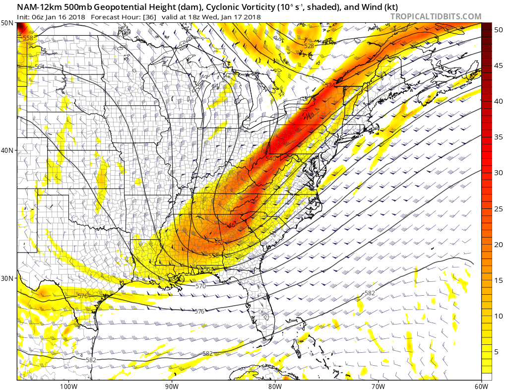 This afternoons model guidance has come into slightly better agreement regarding a large closed upper level low centered over the Great Lakes region this evening. This upper level low has been meandering in about the same position for the past 36 hours or so, but this will change tomorrow afternoon as an impressive Pacific disturbance crashes into the West coast. This disturbance will act as a “kicker” for the upper level low in the Great Lakes, and cause it to elongate while becoming positively tilted. As it does so, a large upper level jet will extend from the Southeast Unites States and into the Northeast.  Some weak moisture will be involved in this initial setup, allowing for snow to break out just ahead of a frontal system as the upper level jet provides some adequate lift along the front. This frontal system will be located over the eastern third of the country by tomorrow afternoon, with snow likely forming over much of the Mid Atlantic and Northeast during the late morning and early afternoon hours. Some light snow may work its way into the NYC metro area later in the afternoon, but there may be some rain mixed in closer to the coast as surface temperatures hover at or above freezing.