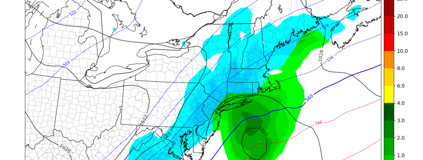 As low pressure moves further east off the Northeast coast and begins to deepen, it will drag colder air in behind it via northerly winds. Precipitation may end as a period of snow for coastal areas with some light accumulations under 2″. In fact, this is occurring already as of 8am over much of the NYC Metro Area. Any accumulations will likely be relegated to colder surfaces as temperatures remain above freezing.