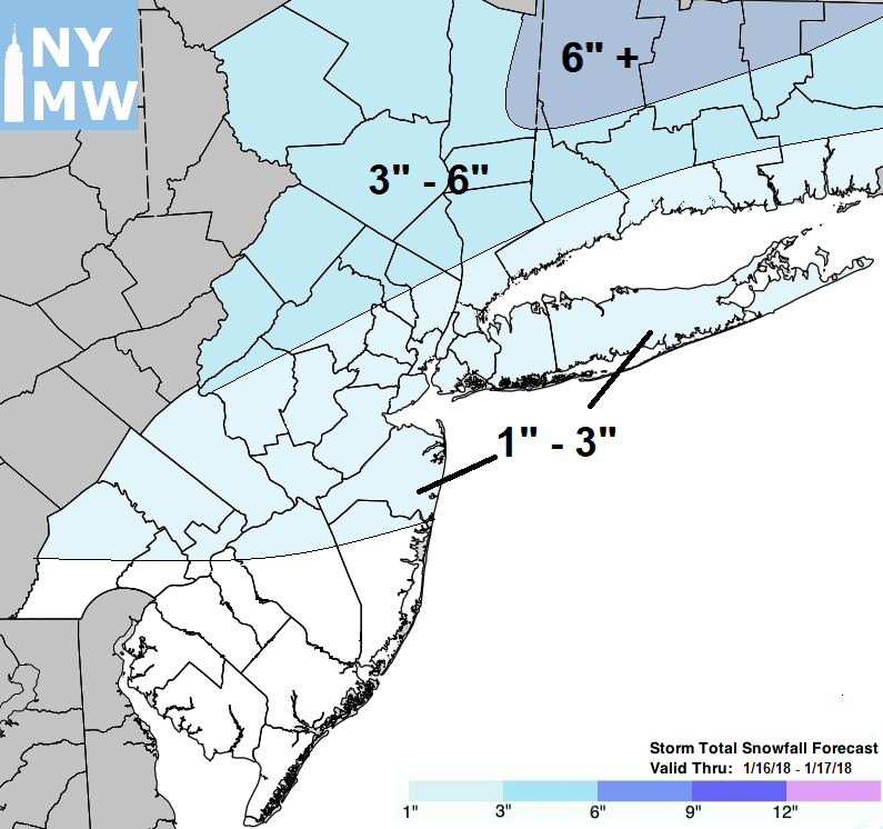 Just inland, however, bands of snow are expected later tonight, and the potential exists for several inches of snow. While quick moving, models suggest enough dynamics for moderate snow in these bands, with quick accumulations of 3-6″ and possibly amounts higher than that in the highest elevations of Northwest NJ, Northeast PA, Southeast NY and New England. The winter storm is expected to be moderate impact in these locations, with a lighter impact event in NYC and even lighter along the coastal plain.