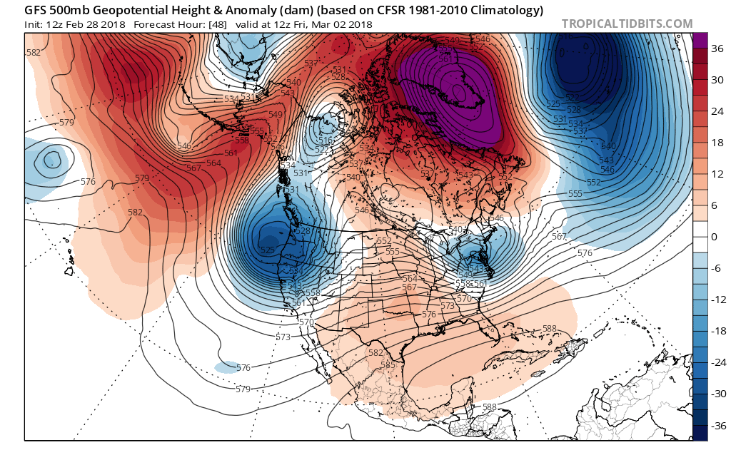 This afternoons model guidance continues to show the potential for the primary low pressure system that travels over the Ohio Valley to redevelop just off the Mid Atlantic coast early Friday morning, but there are still a large amount of uncertainties with this forecast. Regardless, what we do know is that an area of blocking will be located over Greenland, which will act to slow down the mid level system and allow it to strengthen as it nears the coast. This should lead to the development of a strong low pressure system adjacent to the Mid Atlantic coast during the day on Friday, likely leading to a wide range of impacts. Almost all of the model guidance shows an impressive swath of winds just above the surface with this system due to a tight pressure gradient. Additionally, this system will be capable of tapping moist air from the south, so it will likely have a good amount of moisture to work with, leading to the development of widespread moderate to heavy precipitation. Lastly, winds out over the ocean will likely be directed towards the coast, which will create at least a moderate threat of coastal flooding as we enter a full-moon phase. One of the main things we do not know at this time is exactly when and how much phasing will occur with the two original disturbances over the Ohio Valley. A quicker phase would lead to a stronger coastal low tucked right along the coast, while less/delayed phasing will likely lead to a weaker and more elongated system.