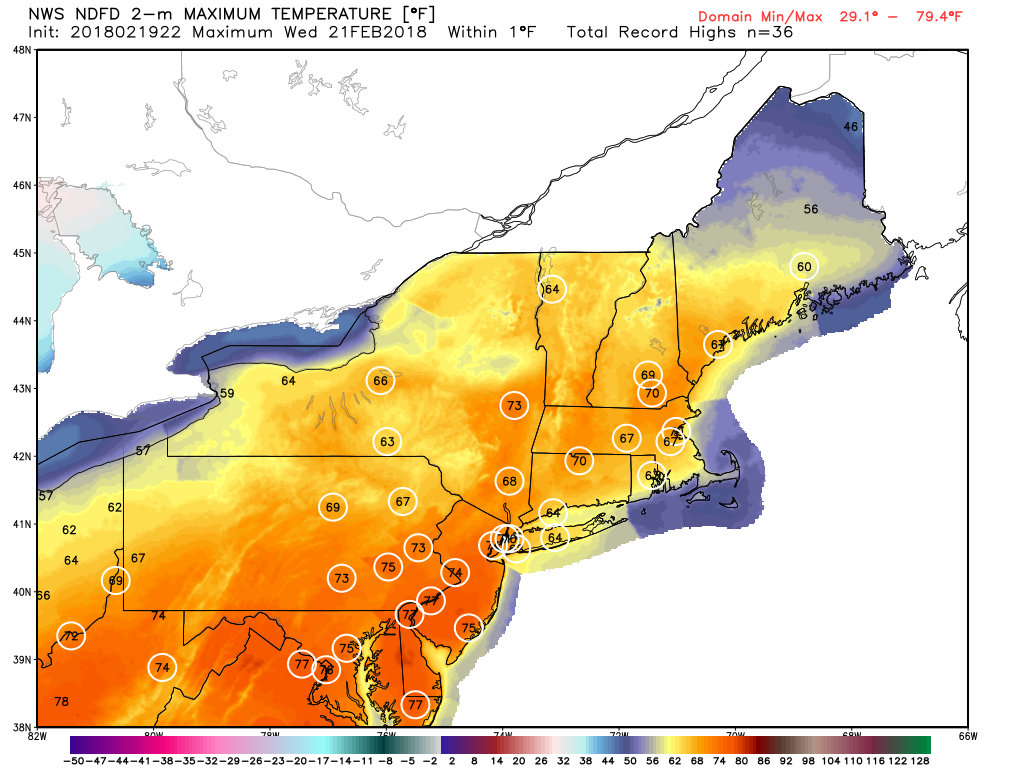Wednesday looks to be one of the more mild days of the week as the area of high pressure that has been dominating the east begins to move off the Mid Atlantic coast. This should create more southerly flow in the mid to low levels of the atmosphere, bringing in slightly warmer highs for the afternoon hours. Moisture looks to also increase with the southerly flow as a shortwave trough digs into the desert southwest, sending some residual energy into the east. This energy out ahead of the main system should allow for some clouds and even a few isolated showers to develop in the late afternoon hours, but not significant rain is expected. Highs will likely be able to rise into the lower to middle 50’s across the vast majority of the Northeast. Cloudy conditions will likely continue throughout the overnight hours, with the threat of a couple of showers lasting into the early morning hours. Cloud cover and southerly winds should keep lows from dipping too much, with readings likely staying in the middle to upper 30’s-with some locations seeing lows in the lower 40’s.