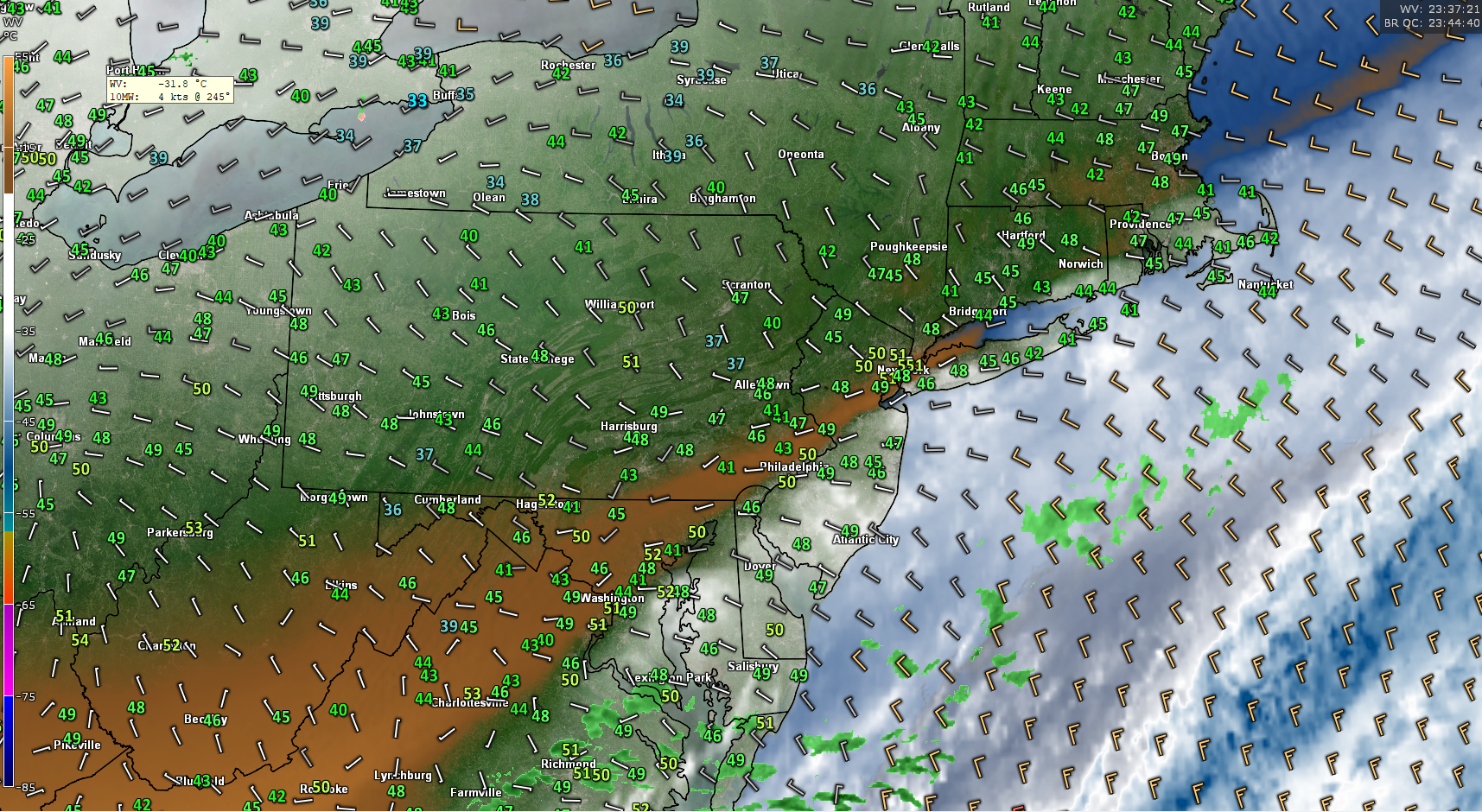 This evenings latest high resolution water vapor imagery, surface observations, and surface winds, showing a more calm temporarily setting up.
