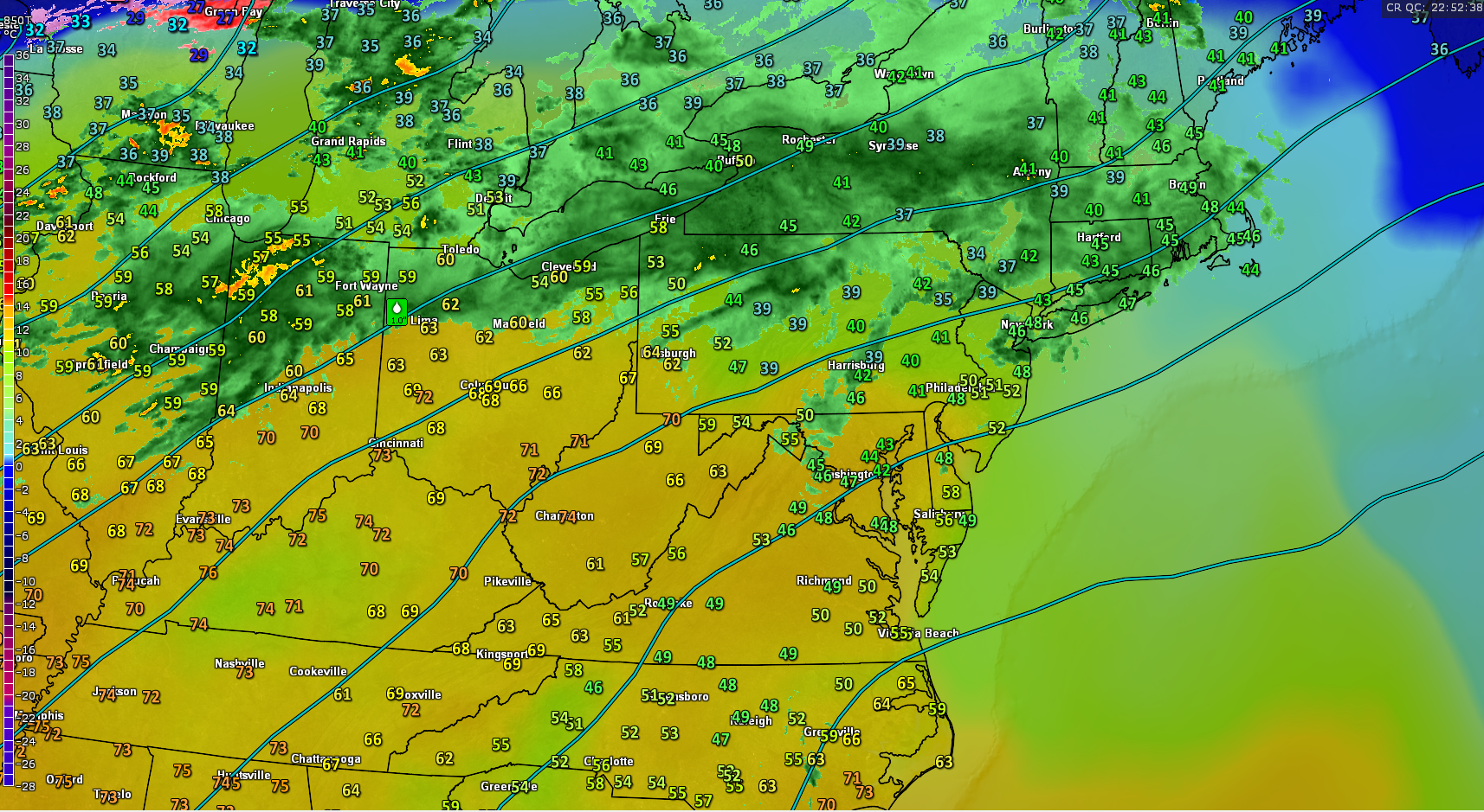 Tuesday will likely start off quite chilly, but clear as the area of high pressure continues to build and move eastward with time tomorrow morning. Conditions will be quite dry throughout the majority of the atmosphere, so skies will likely remain mostly sunny for the majority of the day, with a few upper level cirrus clouds passing through. The fresh Canadian airmass in place in combination with the high pressure will work in tandem to keep conditions cool, but not too cool over the entire Northeast. Highs tomorrow afternoon should remain in the middle to upper 40’s, with some inland locations likely hitting the 50 degree mark again. All in all, tomorrow should be a rather nice day, but will likely still require a light jacket to stay comfortable. Tomorrow night looks to be calm and cool as well, but not quite as cool as tonight. Lows will likely dip down into the middle to upper 30’s for the majority of the Northeast, with some locations possibly just getting below freezing.