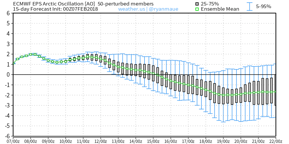 ECMWF EPS showing the AO currently in the positive phase, falling into negative phase after February 15th.