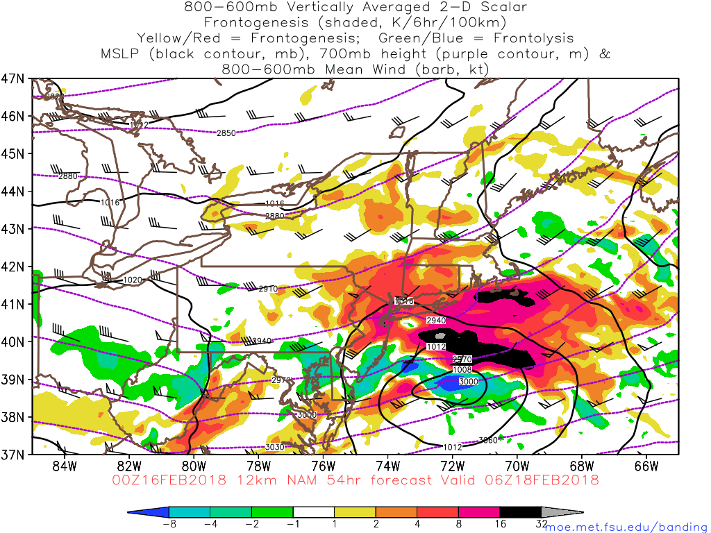 NAM model depicting frontogenesis, areas of enhanced lift, that can lead to heavy bands of snow. Reds, pinks and blacks depict the best lift.
