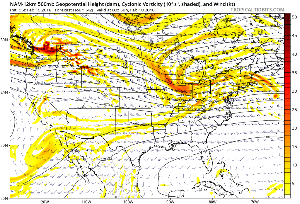 Firstly, the synoptic setup in the mid levels of the atmosphere is not classic for snow in the Northeast States, especially the Northern Mid Atlantic. The best vorticity in the atmosphere’s mid levels tracks to the north and west and the surface low is spawned by energy coming in from the Ohio Valley.