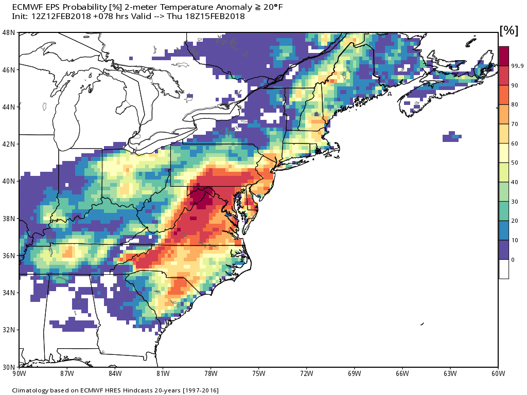 This afternoon European ensembles showing a high probability of temperature anomalies reaching 20 degrees above normal on Thursday!