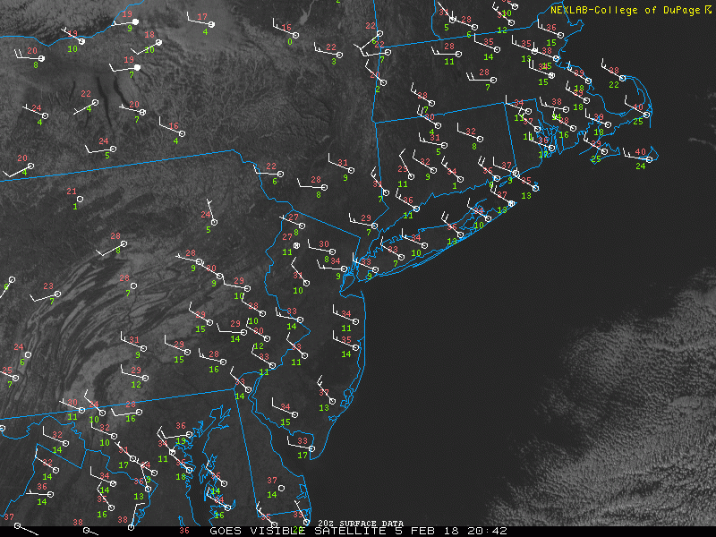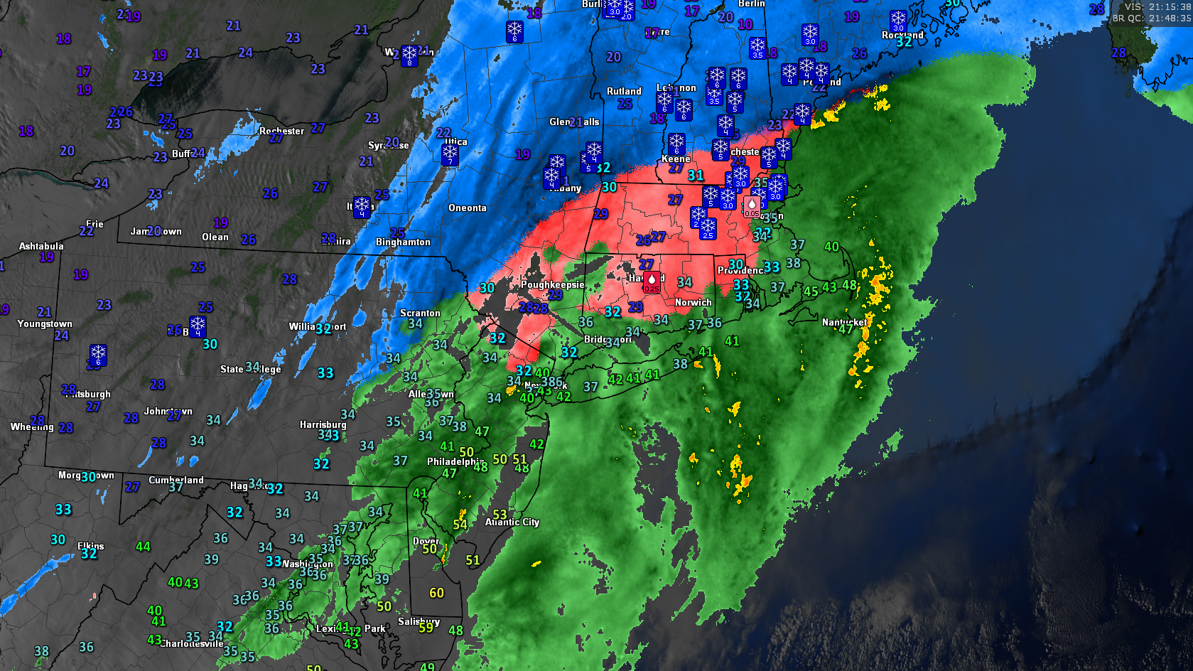 This evenings latest high resolution visible satellite imagery, regional radar mosaic, and surface temperatures over the Northeast showing a wide variety of weather conditions
