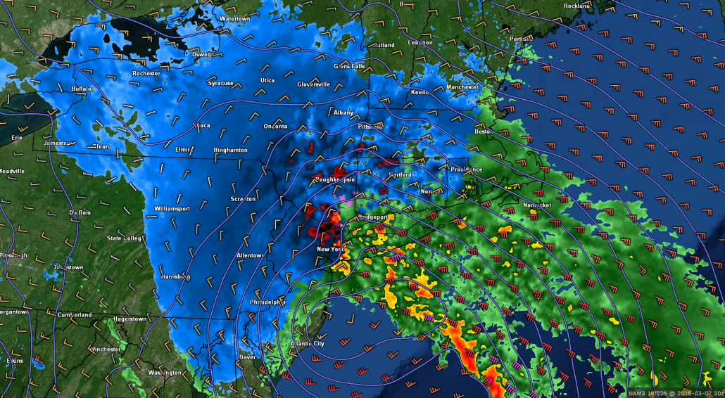 Tuesday’s 18z 3km NAM model valid for 3:00pm on Wednesday shows a dynamically driven area of precipitation allowing NYC to change over to heavy snow, while areas further west keep the classic banding. The immediate coast still has mixed precipitation.