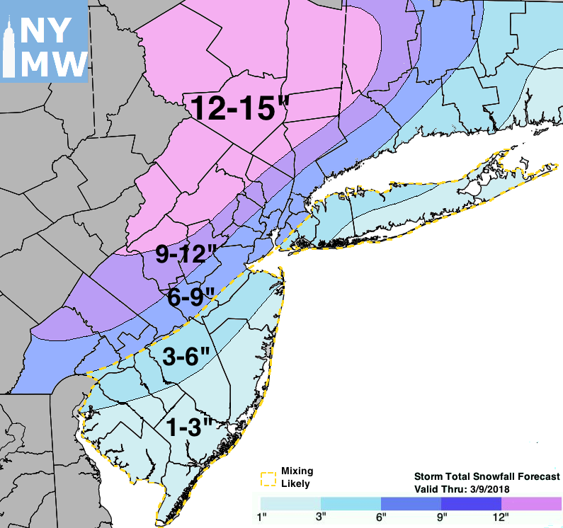 The main question with the system now has become the placement of heavy snowfall bands and the potential for precipitation-type changes as the storm develops. Recent models have tucked the storm closer to the coast, resulting in warmer air changing precipitation to rain and mixed precipitation across parts of NJ and Long Island – while the enhanced dynamics being closer to the coast enhance snowfall inland. Here’s how we expect the system to play out across the Northeast states, with a slightly more detailed focus on the NYC Metro Area: