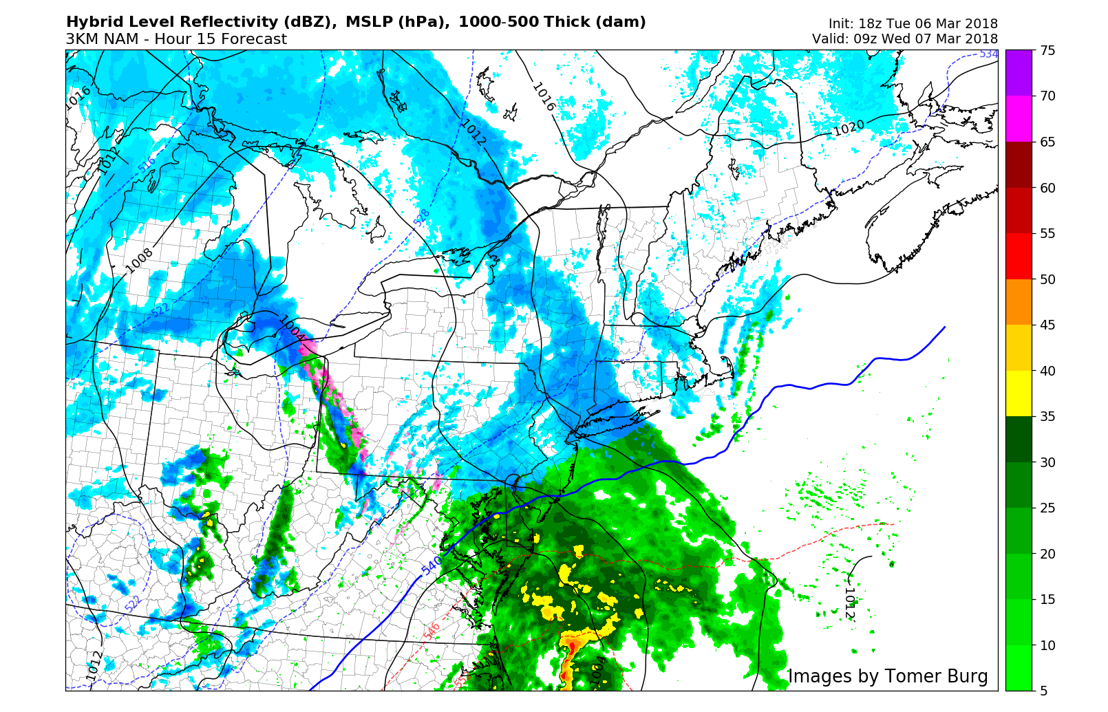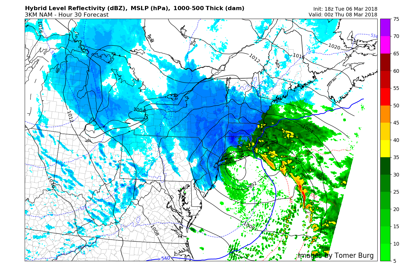 Tuesday’s 18z 3km NAM model valid for 7:00pm on Wednesday evening shows a “wraparound” band of snow pivoting across the area, even changing some coastal areas back over to snow (Tomer Burg).