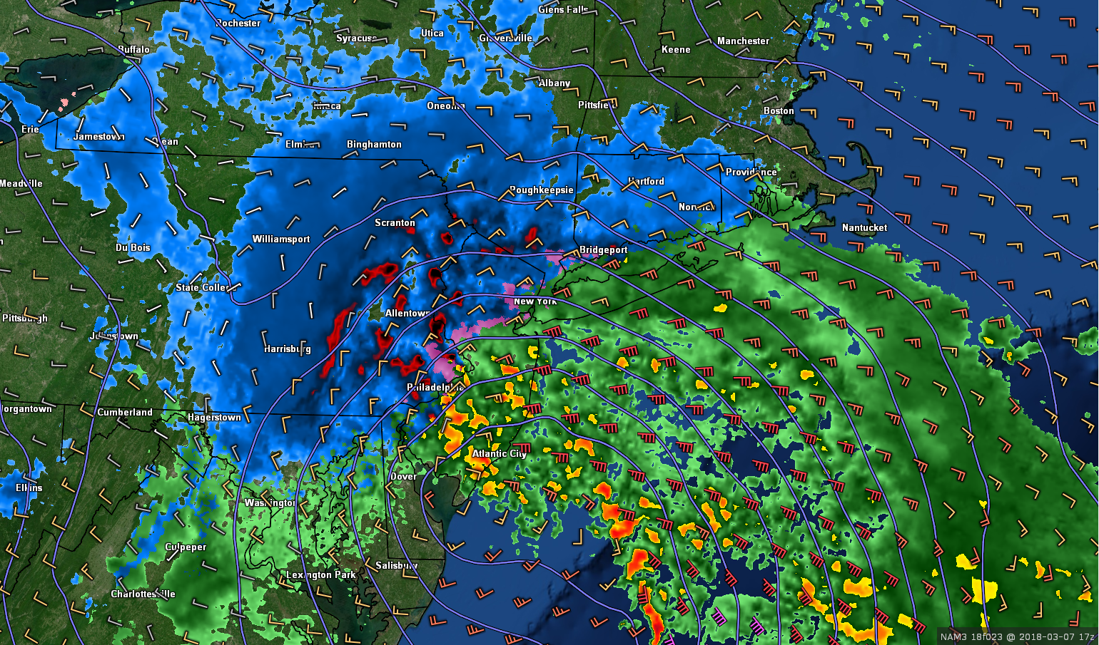 Tuesday’s 18z 3km NAM model valid for noon on Wednesday shows the very heavy band of snow in E PA and NW NJ, but mixed precipitation types closer to NYC and the coast.