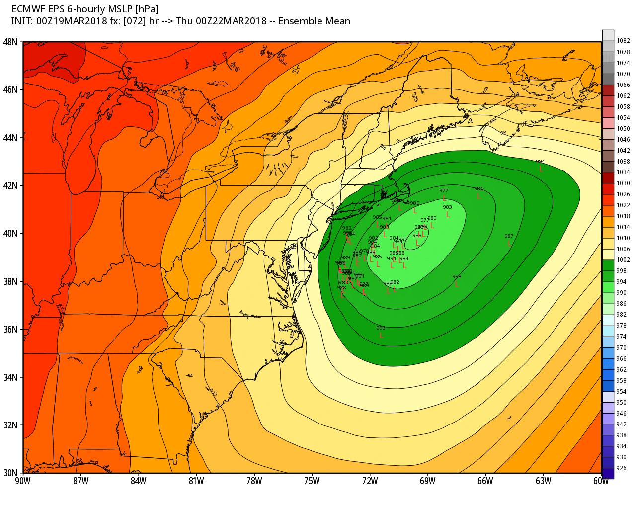 As has been the case for the past few weeks, high latitude blocking (or ridges of high pressure in the higher latitudes) will guide the threat. Ridging near Greenland has forced colder air southward into Southeast Canada and New England. Meanwhile, disturbances are being forced to eject southward and “underneath” this block, into the Tennessee Valley and Mid-Atlantic states. This fosters an environment that encourages the development of low pressure systems near and off the East Coast.