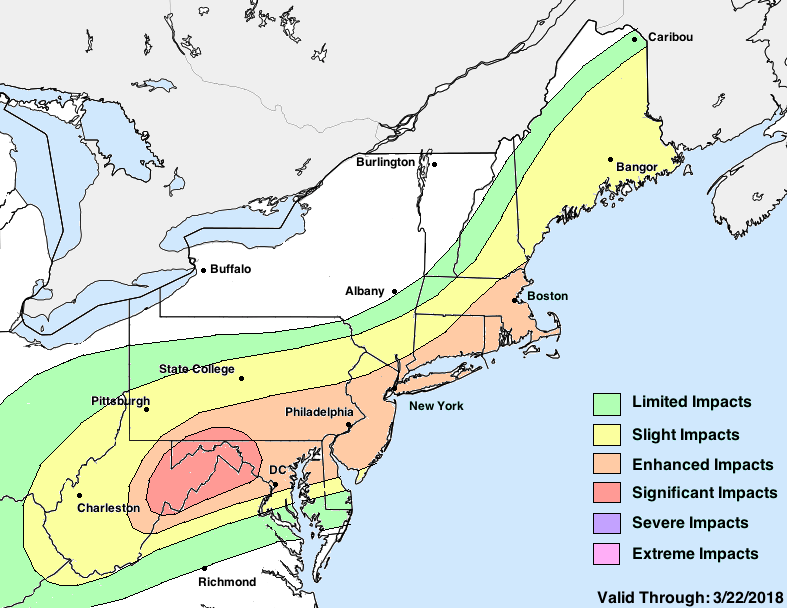 Our impact map that is attached features a few key impact regions. While the map is still in development, its main point is to simply the maps and alerts that you see all over the internet. In other words, we’re trying to make it easy to understand what you should expect. The impacts range from “Limited” (very little impact on your day/operations) to “Severe” (unusual, anomalous, or highly impactful weather that may impact property) and “Extreme”. We hope these maps offer an improved visual as to how we expect the storm to evolve.