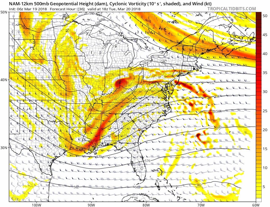 Back to the west, however, intense height falls (or the development of a trough) are forecast to occur underneath the blocking ridge to our north, as disturbances phase and eject towards the Southeast US Coast. This promotes the development of larger trough with more powerful dynamics, and the potential for the development of a strong low pressure system off the East Coast. Forecast models have struggled mightily with exactly how this phasing will occur, how intense the trough development and vorticity development will be, and (Accordingly) where the low pressure will track.