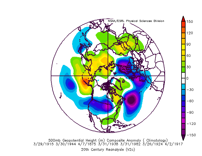 While the pattern advertised in this composite is not exactly the same, they are very similar, especially when looking at it from a progression standpoint, rather than a verbatim match. The important features regarding: 1) The strong Pacific block, its retrogression and weakening, 2) The elongated, eastward moving polar vortex displaced in Southern Canada dipping into the US, and then gradually lifting out to the northeast, with the core of the trough/vortex making its closest approach just before the day of the storms themselves, 3) The -NAO block forming and then gradually weakening, and 4) The Pacific retrogression allowing ridging to form in the Western US — all as the pattern evolution progresses — is essentially an exact match. They both even have the same exact initial Rex Block configuration in the Pacific, with a large upper-level low sitting directly underneath the large Aleutian block!
