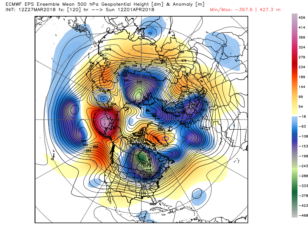 The above map shows the EPS (European Ensemble) forecast for April 3rd. It does indeed show another strong -NAO blocking pattern, with a cutoff ridge near Greenland. However, the main difference between this pattern and the one we had in the March is the Pacific Ocean. The forecast pattern shows a very large blocking ridge near the Aleutian Islands, with some of that ridge bending towards the Arctic — a much higher latitude than what we’ve had in March. This is significant because it allows significant cold to get displaced in Canada, and sends a very large and elongated polar vortex into Southeast Canada. Additionally, the -NAO block forces the core of that polar vortex to stay in that general area, which creates a consistent source of significant cold, while also keeping the storm track to our south.