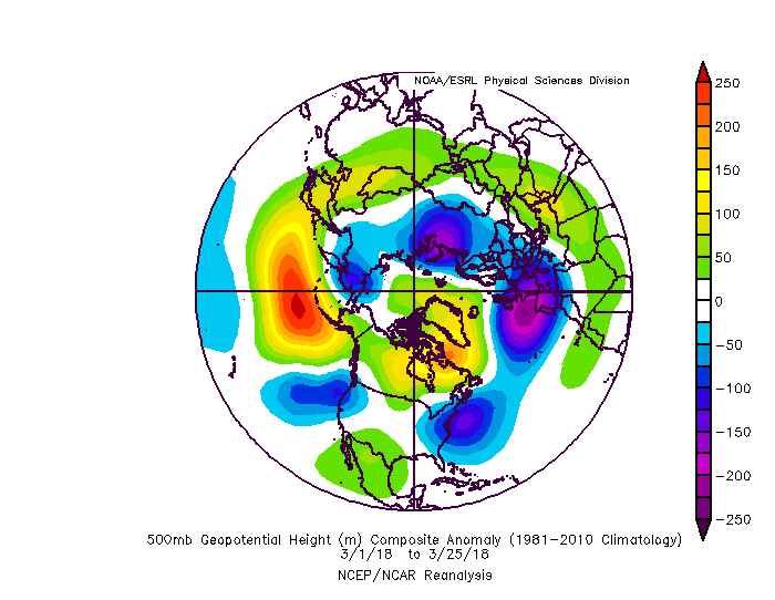 The pattern in March featured a large west-based -NAO block, but not necessarily a Pacific pattern that was conducive for big cold (ESRL/NCEP/NARR).