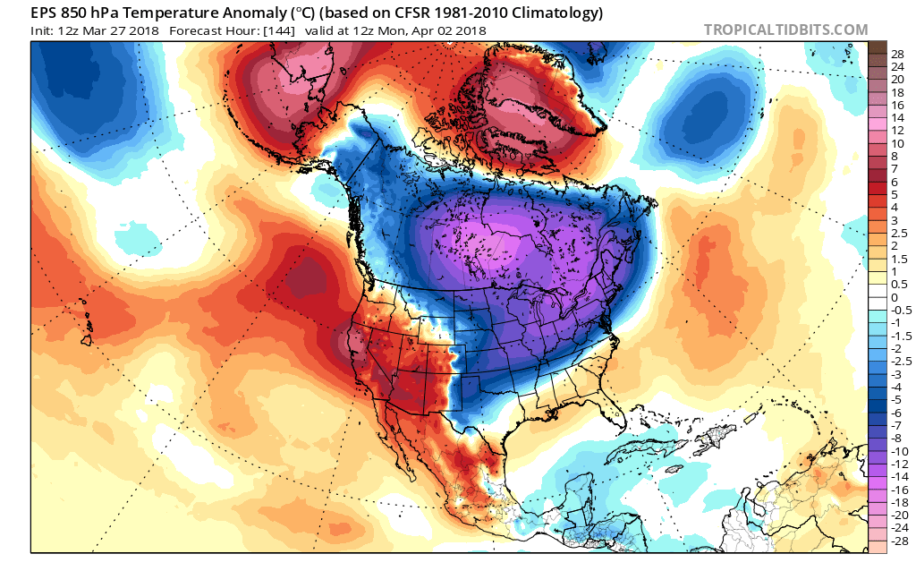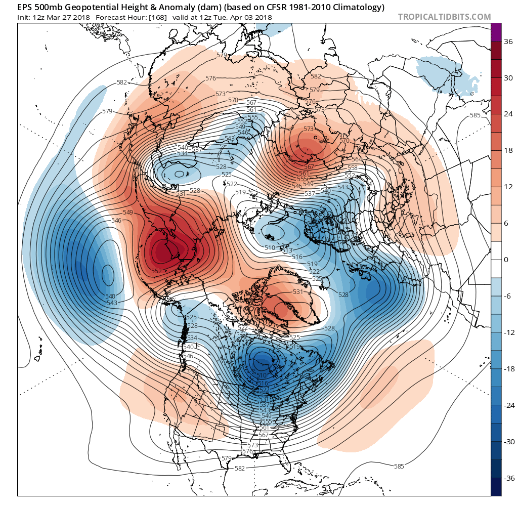Tuesday's 12z EPS valid for April 3rd shows an ideal blocking pattern for generating cold and snow (Tropical Tidbits).