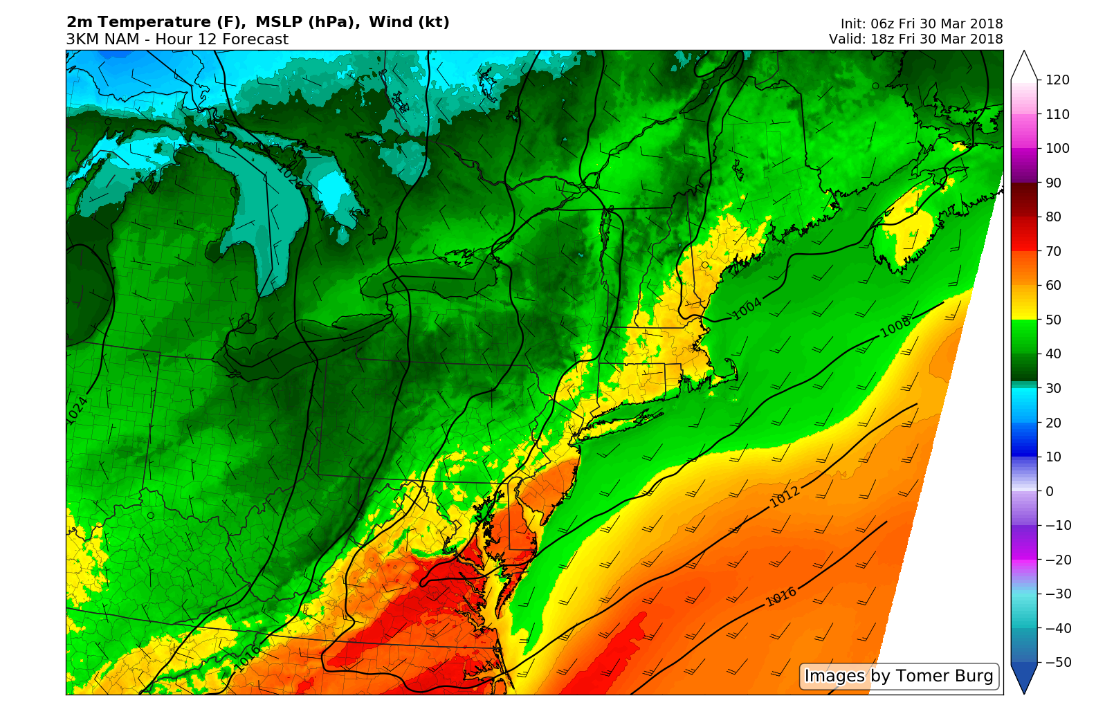 After weeks of fighting through unusually cold weather, warmth has finally arrived this morning. It didn’t do so with a grandiose entrance, however, as dreary and wet conditions accompanied a warm fronts movement northward. This morning, southerly winds are drawing in warmer air which is leading to a spike in temperatures out ahead of a front. This frontal system will move gradually eastward today, into New Jersey and eventually New York City later this afternoon.