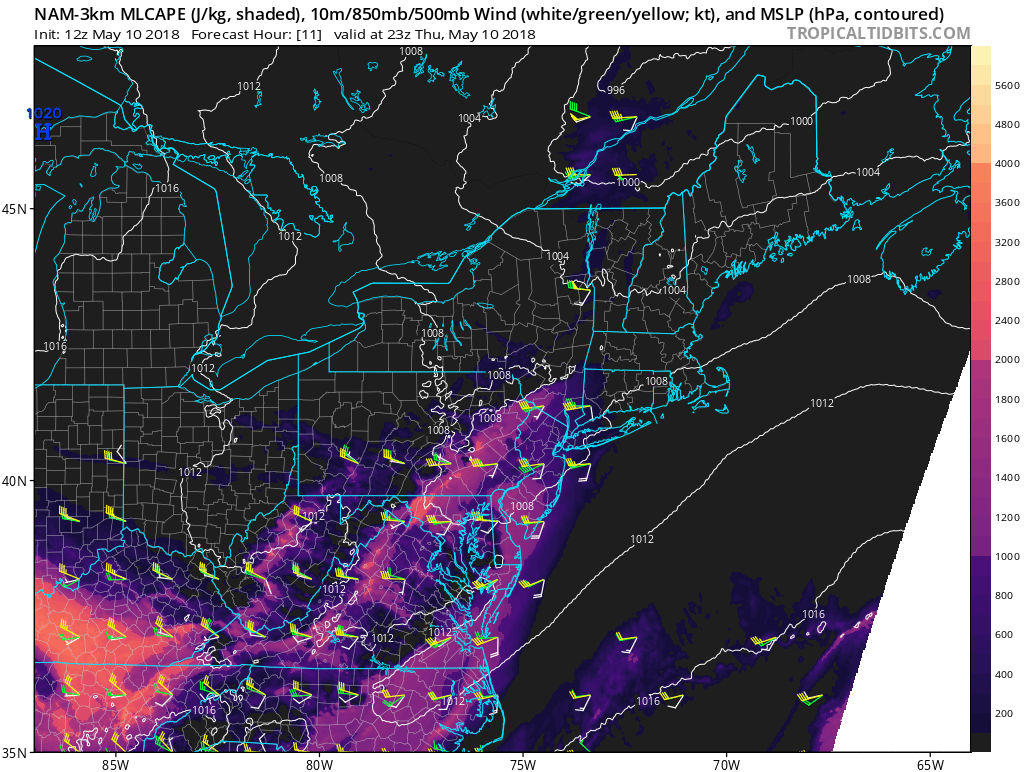 3km NAM model showing MLCAPE values near 1000 J/kg with directional shear over parts of Eastern PA and Western NJ early this evening.