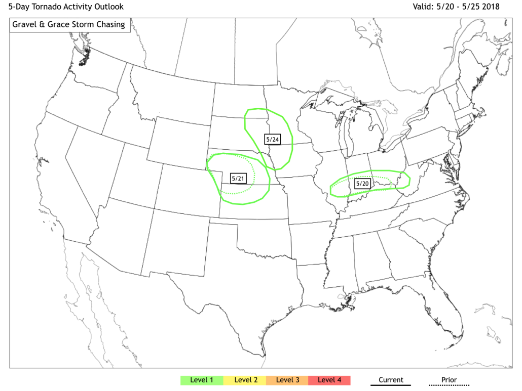 *A brief note regarding these outlooks – they are clearly a beta and are not meant to replace official SPC or NWS outlooks. However, we are really excited about the possibilities with them. Level 1 is meant to delineate the areas where a few tornadoes are possible. Level 2 features more organized activity. Level 3 is a high or unusual concentration of tornadoes, while Level 4 is outbreak or extremely unusual concentration of tornado activity. We’ll build on this list and categories as we go…feedback is encouraged!