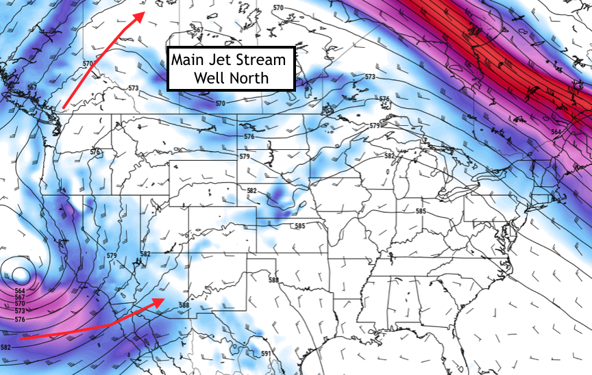 Compounding our problem is that we are beginning our trip during an unfavorable mid and upper level atmospheric setup. In fact, it is extremely unfavorable. The mid and upper level jet stream is situated well to the north of the United States, completely displaced into Canada by a poleward reaching Pacific Jet stream and amplified high latitude hemispheric weather pattern. This has led to very infrequent severe weather opportunities across the lower 48 over the past several days and will continue to mitigate chances through about Wednesday.