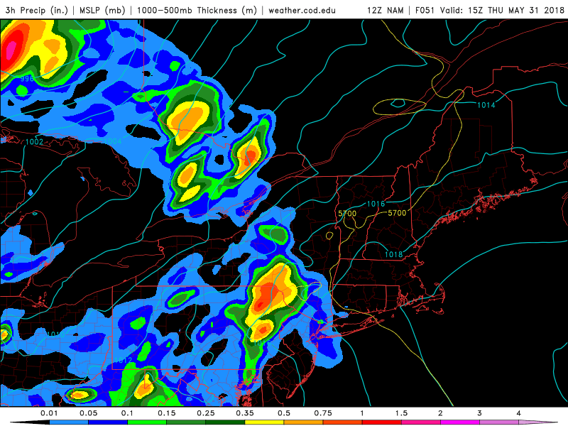 NAM model showing showers ahead of the approaching warm on front in parts of the Northeast on Thursday