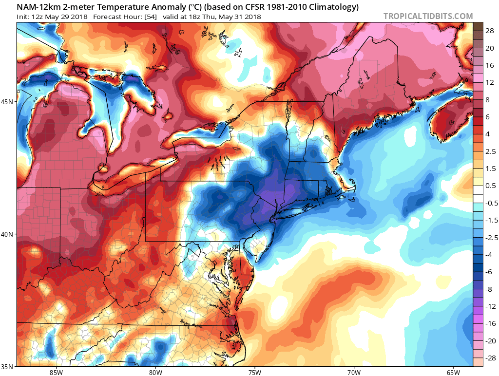 On Thursday and Friday, a frontal system associated with a shortwave trough will begin approaching from the Great Lakes. This system will begin to force the backdoor cold front to return north as a warm front. But exactly how quickly the warm front moves northward, as models have shown differences with frontal timing. On Thursday, we see currently high pressure will only be slowly departing east of New England. So more southeast winds, ahead of the front, are likely to result in a more marine airmass with mostly cloudy skies again over much of the region, through at least Thursday night. Lift and some weak elevated instability, from warm-air advection aloft, may also lead some scattered showers, isolated thunderstorms or just some drizzle, for parts of the local region.
