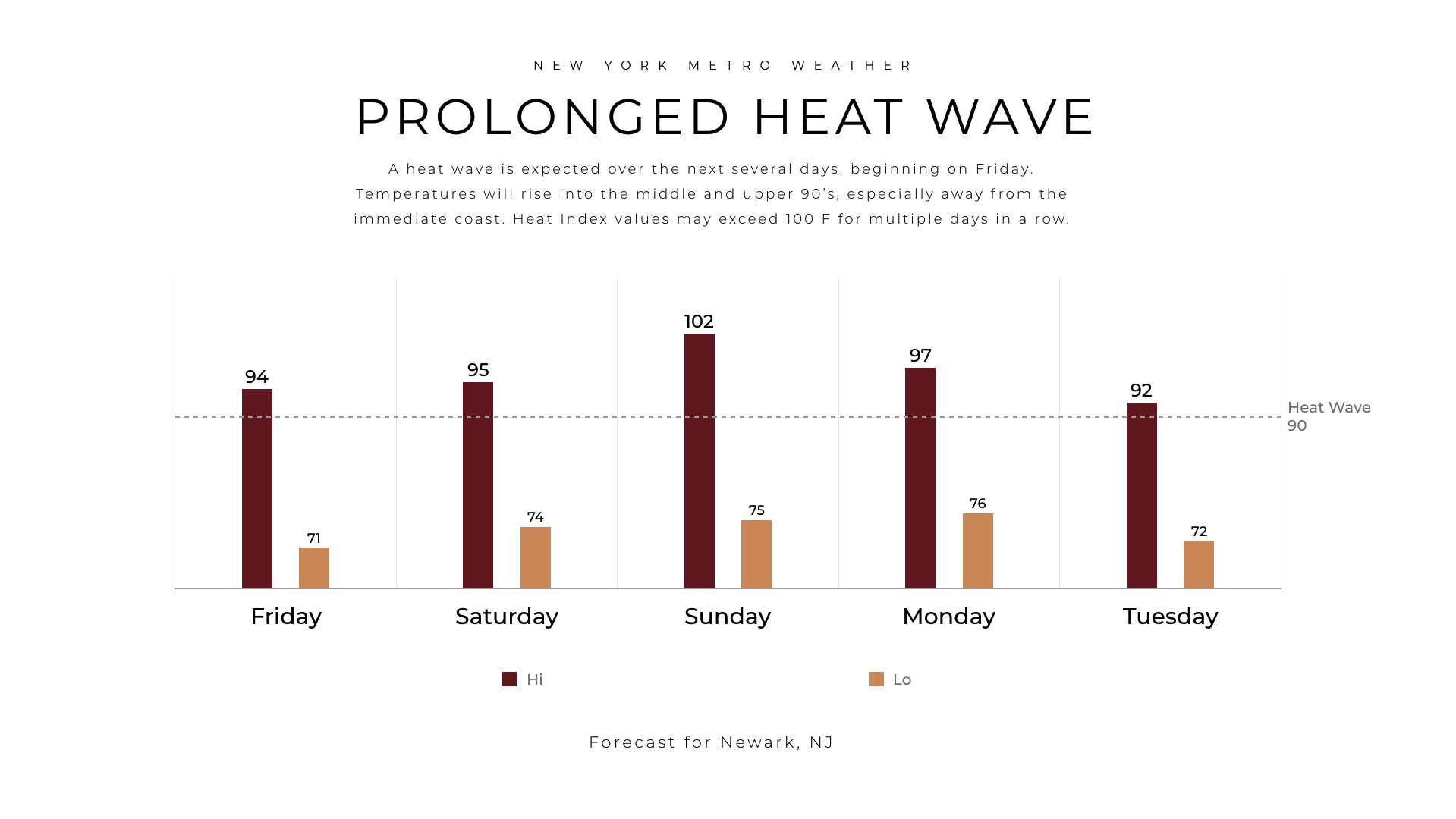 Our official forecast for temperatures in Newark NJ features a high of 102 on Sunday.