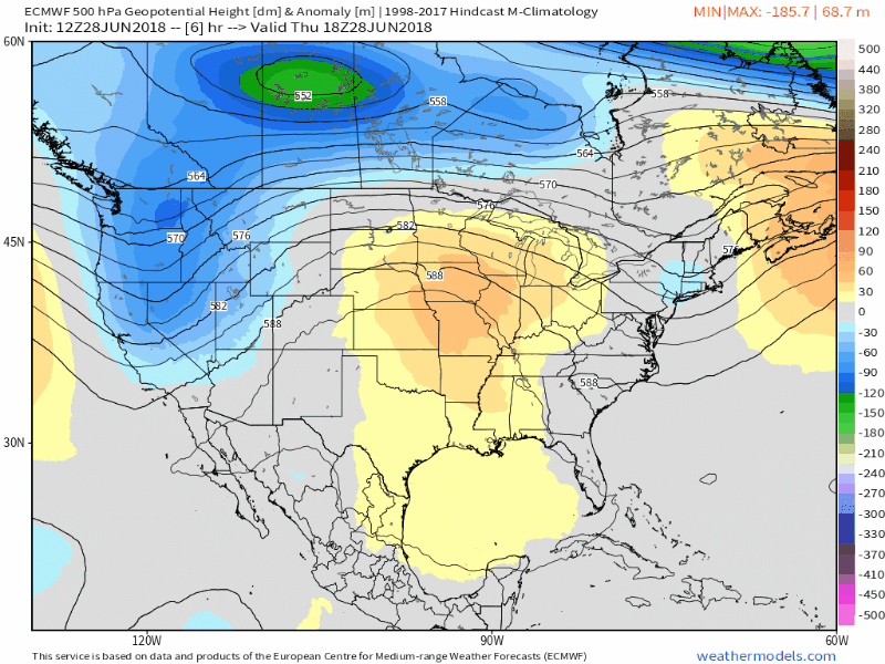Most notable of all is the resilience and duration of the ridge and the very high atmospheric heights it is bringing with it. The Euro and GFS models both agree that heights will not only remain extremely high into early next week – they will actually rise as the ridge strengthens over the Central United States. A westerly flow in the low to mid levels will actually continue to advect very warm air into the Northeast states as the week goes on, with a secondary “peak” in heat possible towards the tail end of next week.