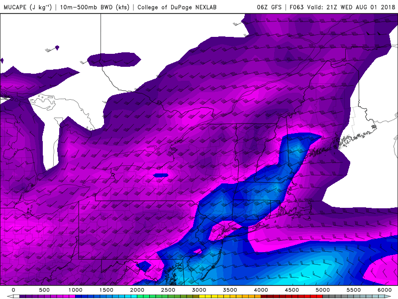 GFS model showing moderate instability with MUCAPE 1000> and 10m-500mb bulk shear for some strong to severe thunderstorms on Wednesday near and just northwest of the urban I-95 corridor in the Northeast
